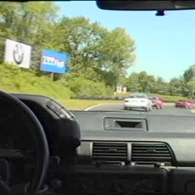 Race car POV as it crashes head on into another car on the track. POV car keeps driving with broken window glass. Racing.
