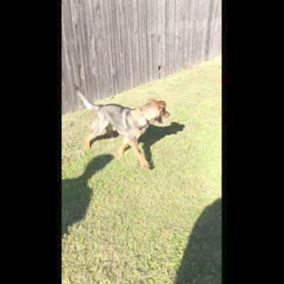 A deer gets its head stuck in a bag and runs into objects all around a yard as a man tries to help it.