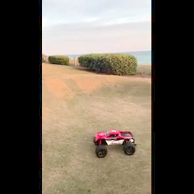 A young boy struggles to control a remote control car outside and the car knocks him over and then runs him over on the ground.