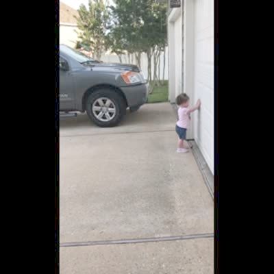 A tot girl runs away from a truck parked in the driveway after she pushes the alarm button on the key fob.