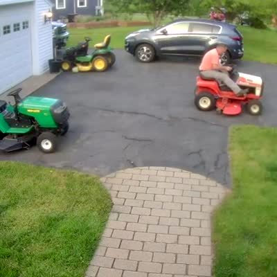 A man drives a tractor up to a ramp and tries to get it into a pickup truck on a driveway, but it gets stuck, then he and the tractor both fall off the ramp. Security footage.