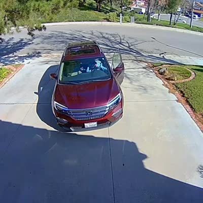 A woman driving an SUV accidentally backs up over a bicycle lying in the driveway. She exits the vehicle to investigate but fails to put the car in park, causing it to roll backwards into the street and hitting a parked car at a neighbor's house. Security footage.