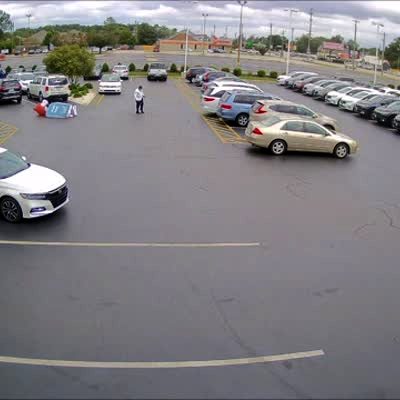 A produced video set to music of a large balloon mascot that blows out the door of a car dealership and across the parking lot. The video cuts to different camera angles as a man runs out of the dealership and chases the balloon around the lot. Security camera footage
