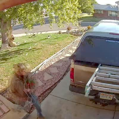 A woman walks onto a driveway and hits her head on a ladder that sticks out of a truck. Security footage.