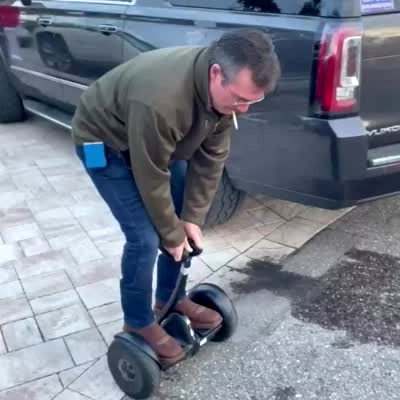 A man smokes a cigarette and tries to ride a Hoverboard Segway scooter in the driveway. The scooter goes completely backwards and he falls off, with his cigarette still in his mouth.