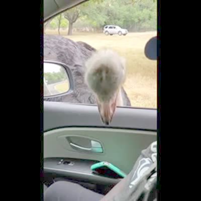 A man holds his hand out of a car and feeds an emu some pellets. The man says, "Ow!" each time the emu pecks at his hand. The ostrich then goes to teh front window and pokes his head in but a woman screams as she asks someone to close the window. A young boy asks her to stop because he can't see the emu.