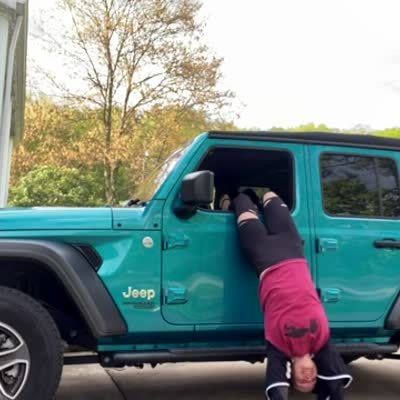 A woman does a hand stand against her car, and she tries to climb in through the window with her feet but she accidentally honks the horn.
