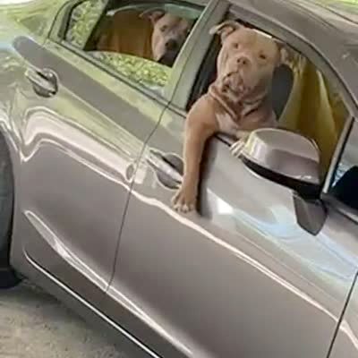 A woman sits in the front seat of a car tells the man driving, "don't roll the window down." A dog in the backseat takes issue with this and howls loudly.