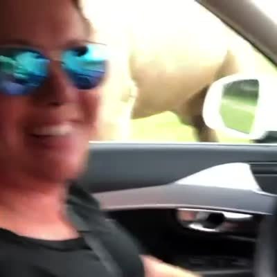 A woman asks her husband "do you hear all the women screaming" while they are in the car at a drive through safari, then she screams when two deer-like animals stick their heads into her car window.