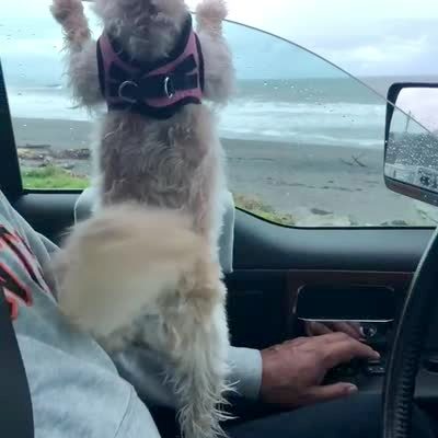 A man opens a car window for a puppy dog at the beach. She sticks her head out the window, then her ears go straight up in the wind.