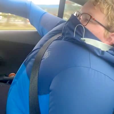 A woman in a car records the snow outside her window with the window open. They pass by a snow blower and the woman gets covered in snow as she screams. The man who drives tells her she should've been more careful.
