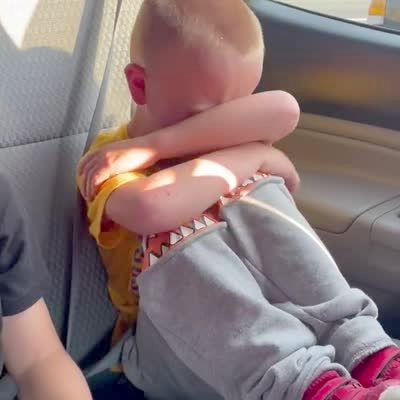 A young boy sits in the back of a car and cries about leaving his friend. A woman says: "you'll see him tomorrow." The young boy continues to cry until he looks out the window, sees something, points and says: "there's a lambo."