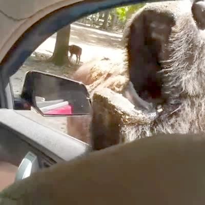 A camel sticks its head far into a woman's car window and honks the horn with its head in a drive-thru safari.