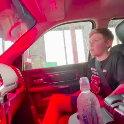 A young boy says "who's scared of the camel now?", then the car window rolls down and he screams at the camel at a drive thru safari park.