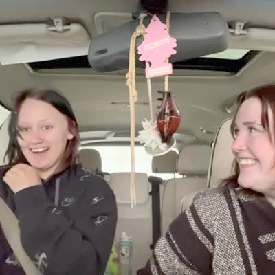 A woman points to a man in a truck and tells her daughter that he's cute in a car. Her daughter says "yeah", then the woman rolls her window down and her daughter sinks into her seat and hides.