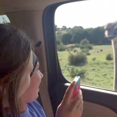 Two women in a car drive through a safari park and an ostrich sticks its head in through the window to eat food and it snatches an iPhone out of the door handle and one of the women has to get out to get it back.