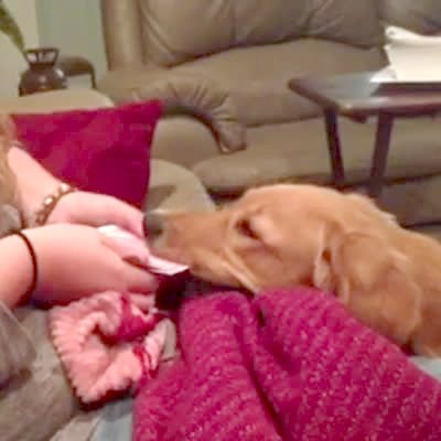 A teen girl fans cards out in front of a golden retriever dog to do a magic trick, and the dog grabs one of the cards and runs away with it.