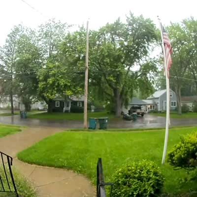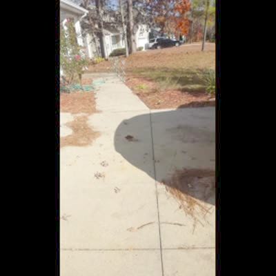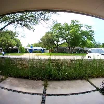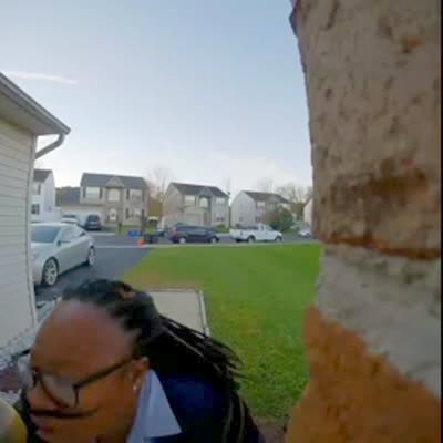 A post office mail carrier delivers mail to a mailbox. Behind her, her mail truck rolls backward down the street. When she notices, she then chases after her truck while it rolls across a yard and hits a house. Security footage.
