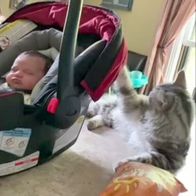 A baby boy sleeps in a carrier in the living room while a cat rocks him back and forth with their paw.