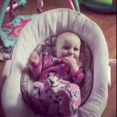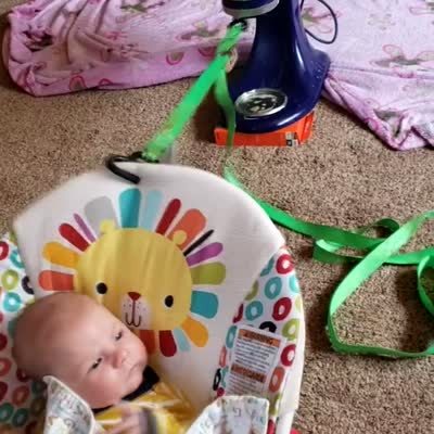 A baby boy rocks in a carrier that's attached to a mixer. The mixer spins and rocks the baby in the house.