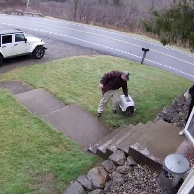 A man delivers mail to a house's front porch, then he farts loudly and trips over a railing when he turns to leave. He laughs and waves at the camera.