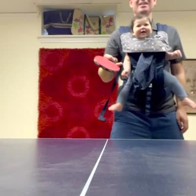 A man plays ping pong while he wears a baby in a front-facing baby carrier. The baby laughs.