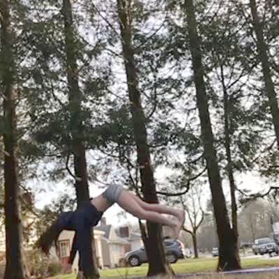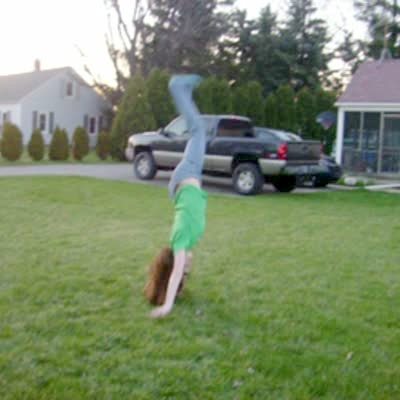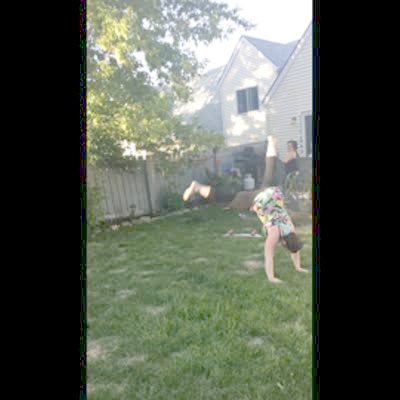 "Hopeless Handspringer" A teen girl repeatedly tries to do a front hand spring in a yard and falls every time. She is terrible at it. Mom says she is going to break her neck. Cartwheel