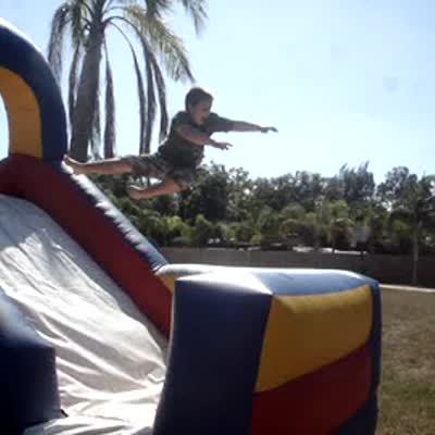 Boy screams, jumps down an inflatable slide on a grassy field, bounces off the bottom & flips over onto the grass.