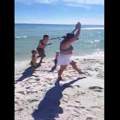 A woman does a cartwheel on a beach. She tries to regain her balance and knocks over a tot boy as she falls down.