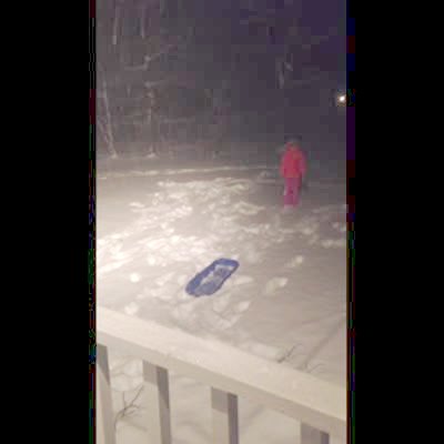 A young girl hits herself in the face with a sled in the snow after she steps on it when she does a cartwheel in the backyard at night.