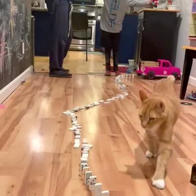 A cat knocks over a long row of dominos, upsetting the young boy who set them up.