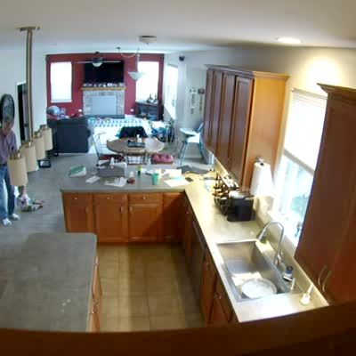 A cat gets into kitchen cabinets and pulls out glass bowls. They crash onto the floor and a senior woman comes into kitchen confused about what happened.