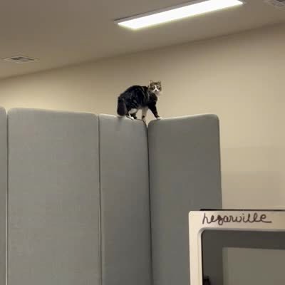 A cat climbs along the top of a cubicle wall it jumps into a light and hits its head.