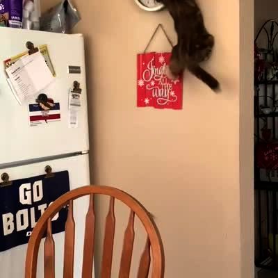 A cat jumps on to the back of a dining room chair. The she jumps towards a clock on the wall and falls.