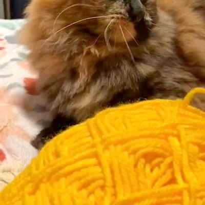 A cat plays with a ball of wool on a bed in a bedroom and it rolls and slips and falls off the bed.