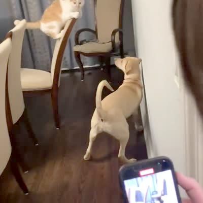 A cat leans over the back of the dining room chair when a dog walks towards it, then the chair falls over.