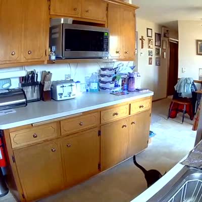 A cat jumps up on the kitchen counter where tin foil is laid out. When its paws touch the foil it bounces up into the air landing on the opposite counter. Security footage.