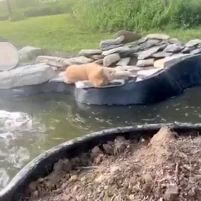 A cat relaxes by the edge of a pond in a yard and rolls over and falls into the water and scrambles out while the woman filming laughs.