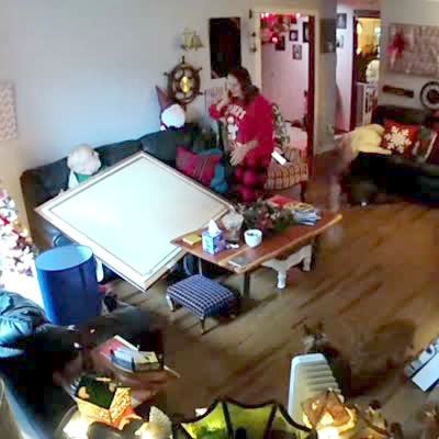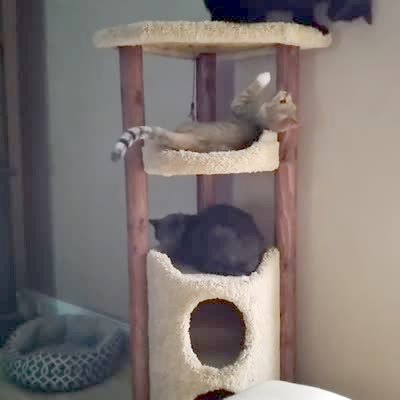A woman sits on top of a cat tower as part of an elaborate prank to distract another woman who walks in the room and is supposed to get scared by man behind the door. The woman on the tower falls backwards and takes a tumble to the floor.