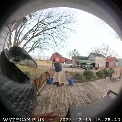 A man walks up to the front door then screams with fear when a snake wrapped around the doorframe lunges at him. Security footage.