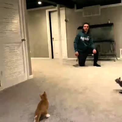 A man holds a plate with cat food. A cat walks on a treadmill to eat it, sliding backwards repeatedly.