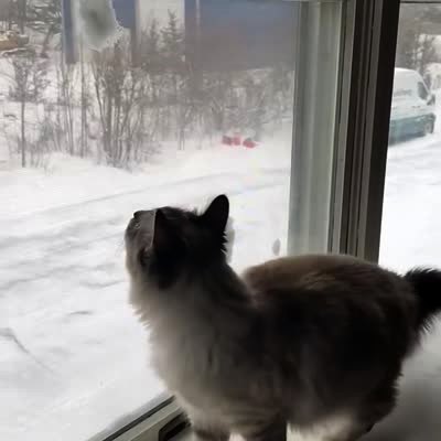 A cat paws at a window when a snow ball hits the pane and it scares the cat causing it to fall to the ground.