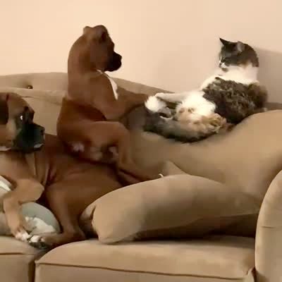 A dog whines with a cat's tail over her eyes in a living room, then the cat moves, and she stops.