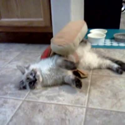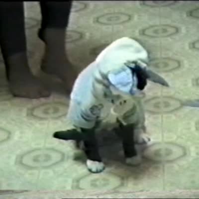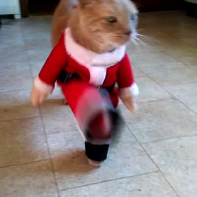 Cat dresses as Cheerleader; owner moves paws - from behind towel