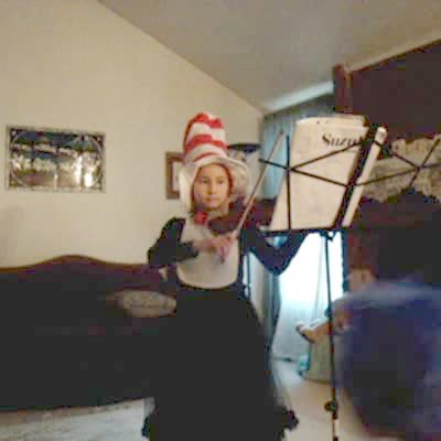 Girl dressed as the Cat in the Hat plays violin, tot brother and sister run around dressed as Thing One and Thing Two. The tots bump into each other and fall down. Halloween costumes, siblings. Odd visual.