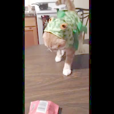 A cat walks backwards in a frog Halloween costume on a table and falls down.