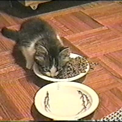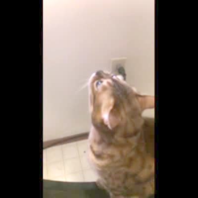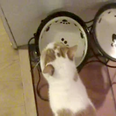 White & brown cat makes strange noises while drinking from his water bowl in the kitchen. Possible fake.