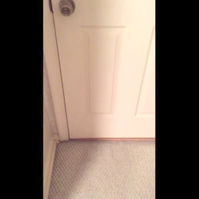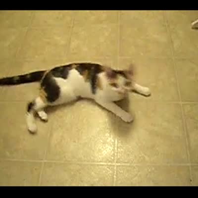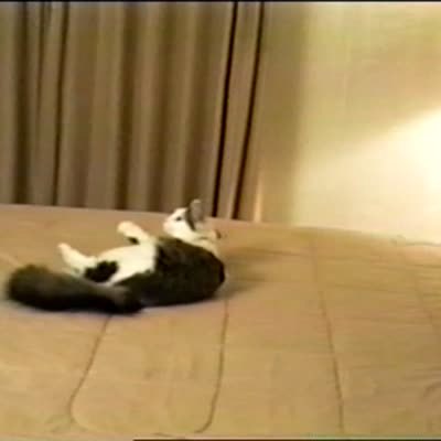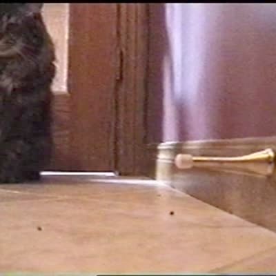 Cat hits a door stop / spring and it makes a weird noise. Funny visual.