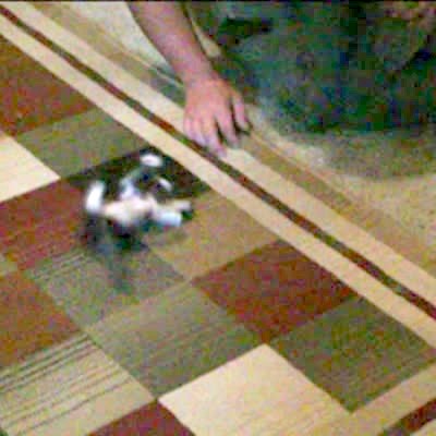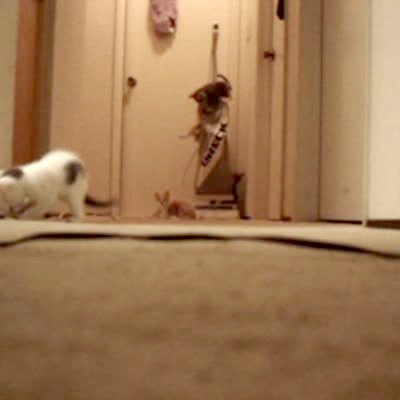 Several kittens crawl on vacuum in hall, scatter when vacuum is turned on. Cats.