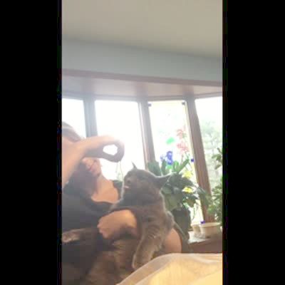 A woman sits in a chair in the living room and makes animal noises. Her cat jumps up at her, and the woman screams and knocks the recliner backwards and onto the ground. Security footage.